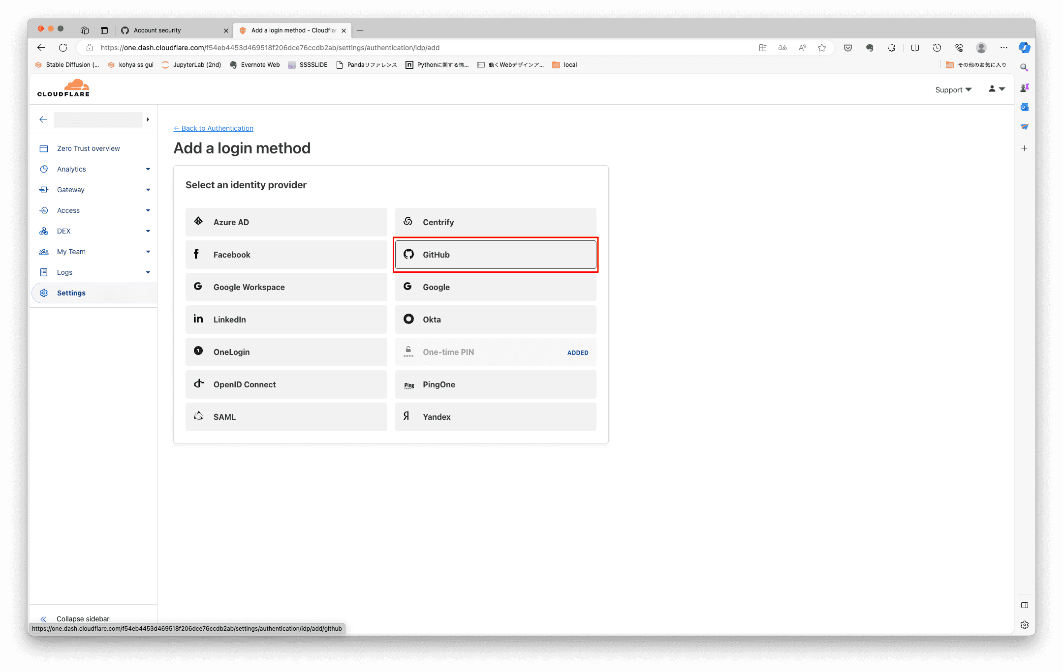 Cloudflare TunnelはOIDCやSAMLにも対応しており、GitHubやAzure AD(改めMicrosoft Entra ID)をIDプロバイダーとして利用することができます。そうするとIDプロバイダーが用意しているユーザー認証を使うことができます。