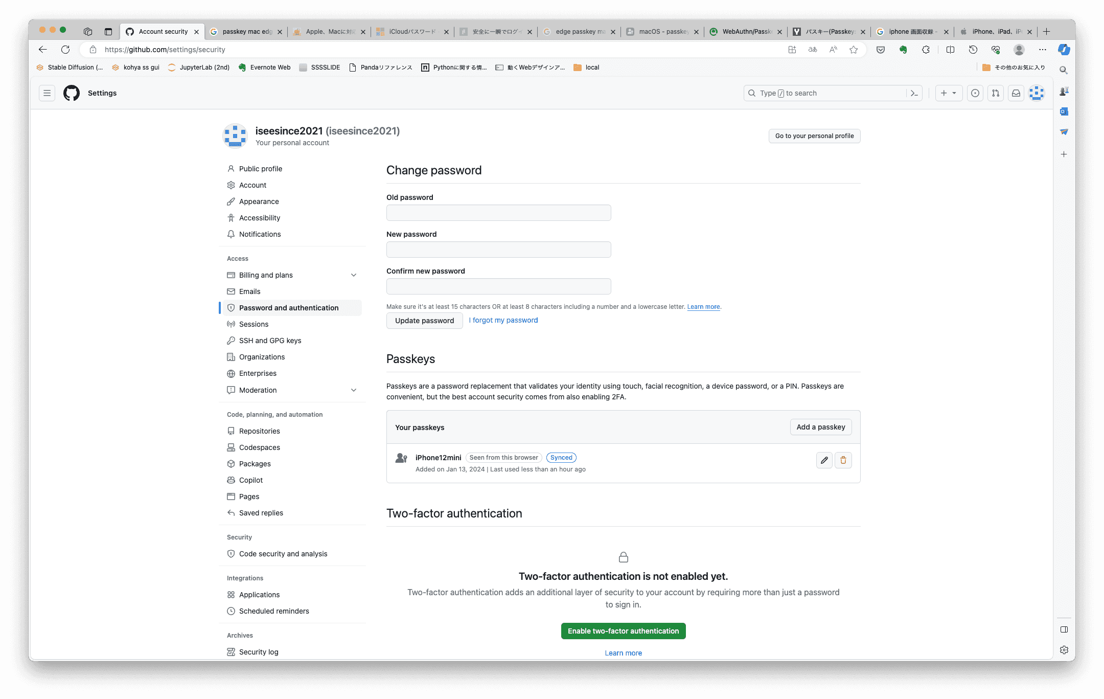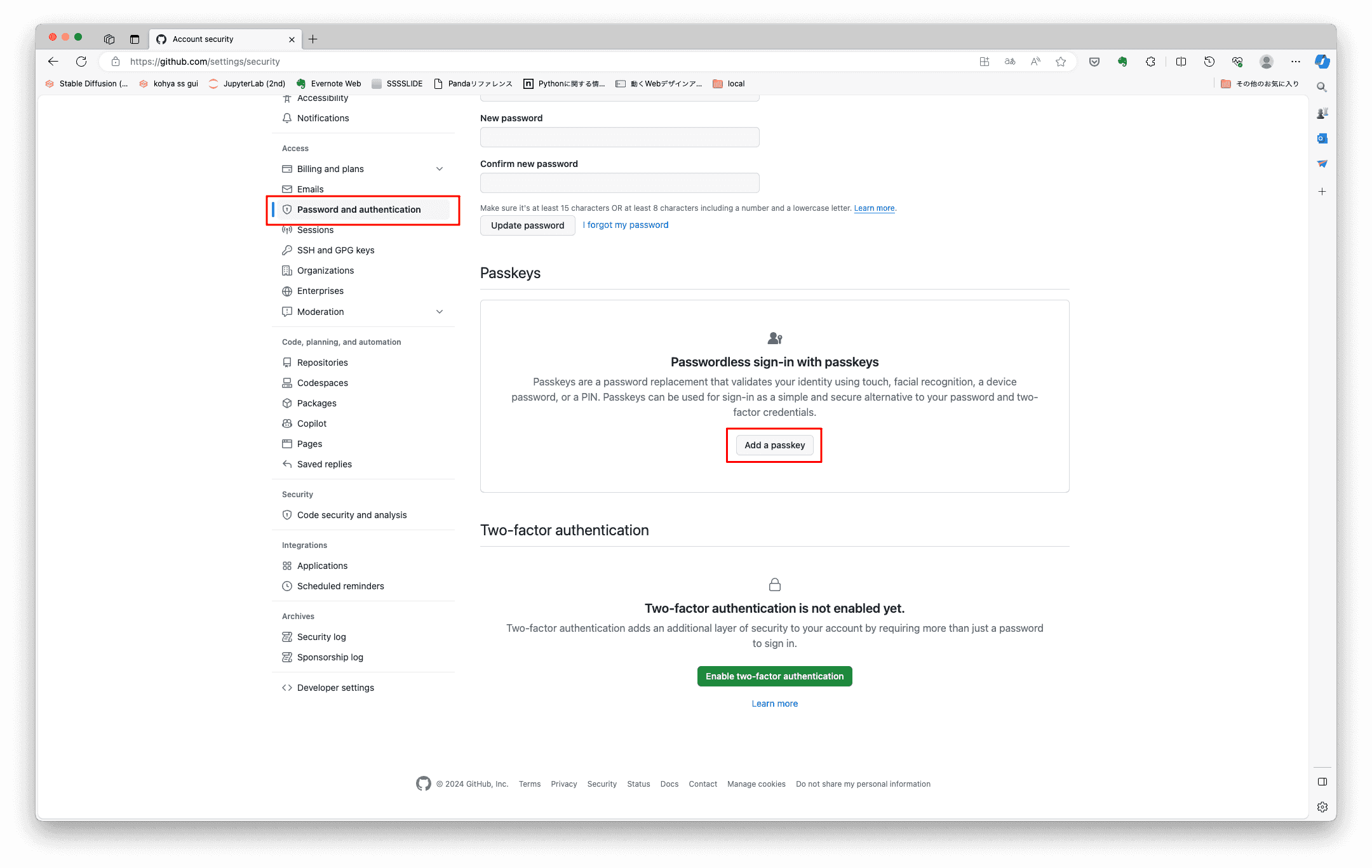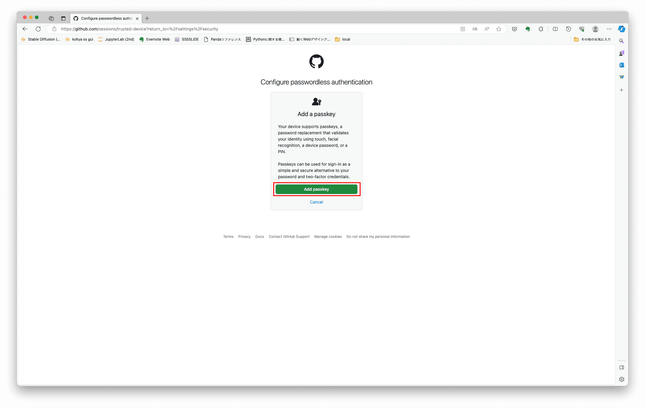 GitHubの設定画面でPassword and authenticationのページに移り、Add a passkeyを選択します。