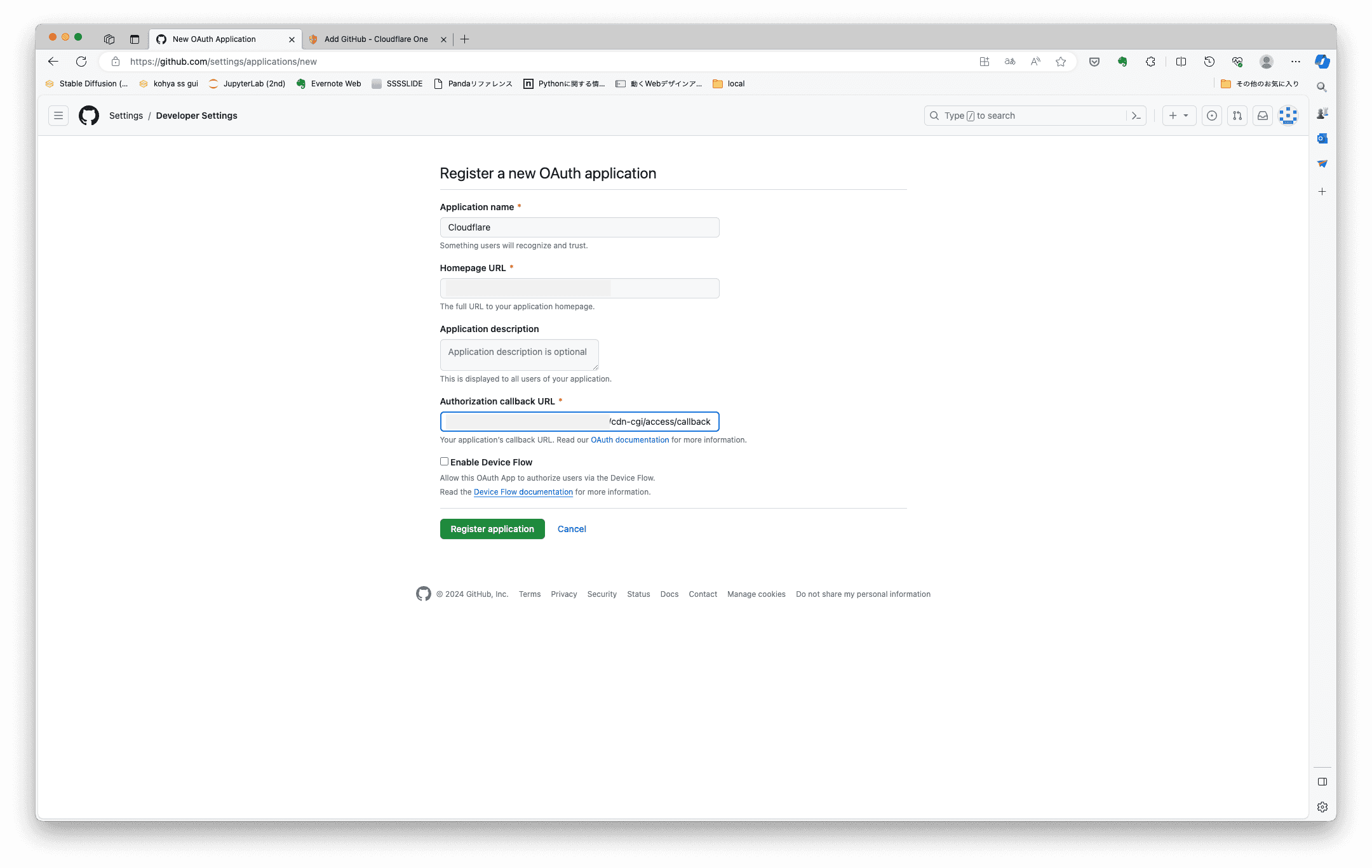 必要な項目を入力します。Callback URLはHomepage URLに/cdn-cgi/access/callbackをつけたものとなります1。