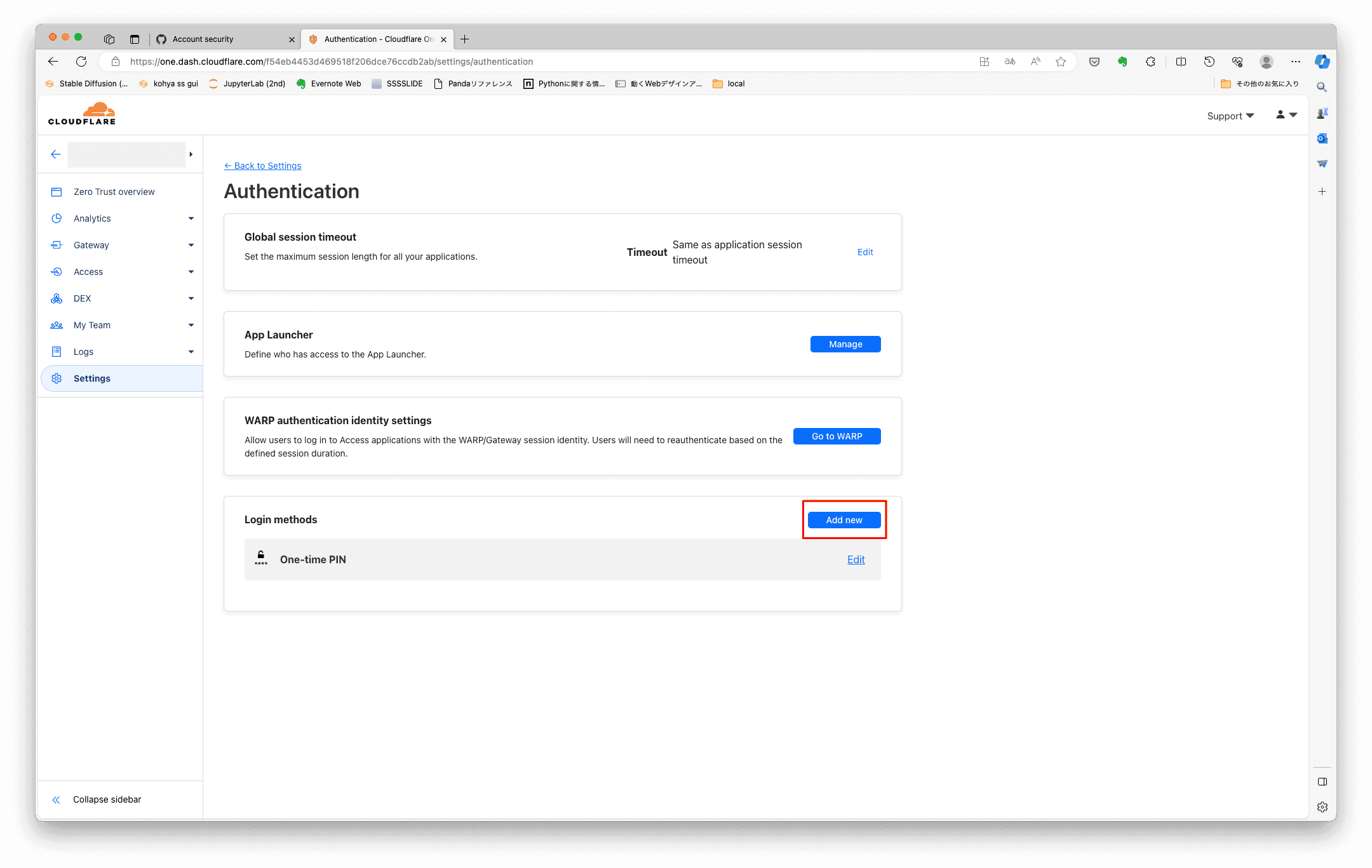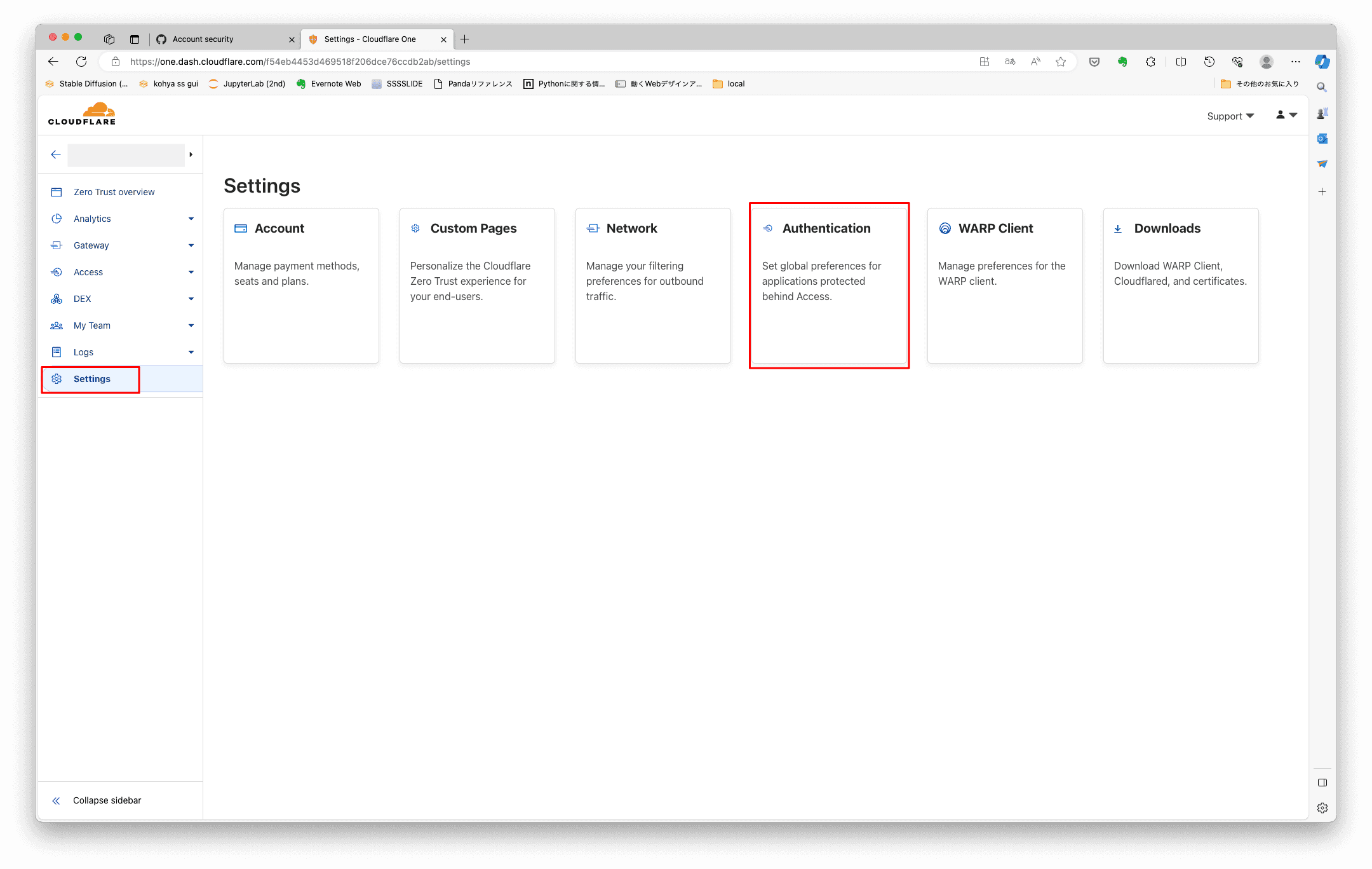 Cloudflare Zero Trustの設定画面に入り、Authenticationを選択します。