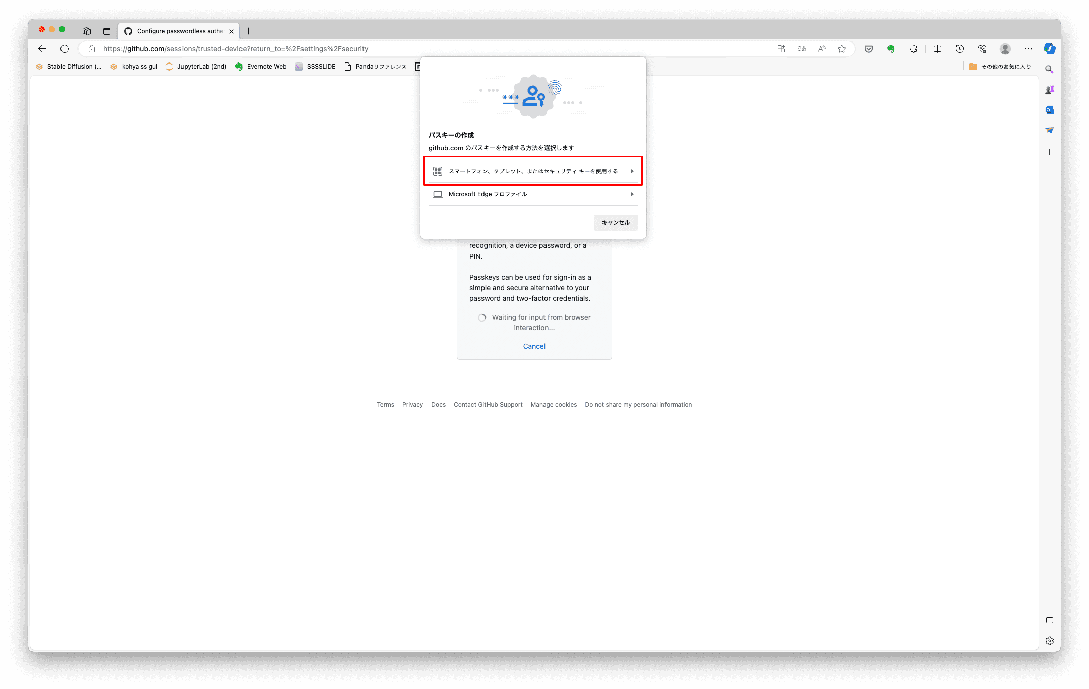 パスキーを作成する方法をブラウザが提示するので、今回はスマートフォンを使った方法を選択します(ブラウザや既存の設定によって一部動作が異なります、スクリーンショットはEdgeです)。