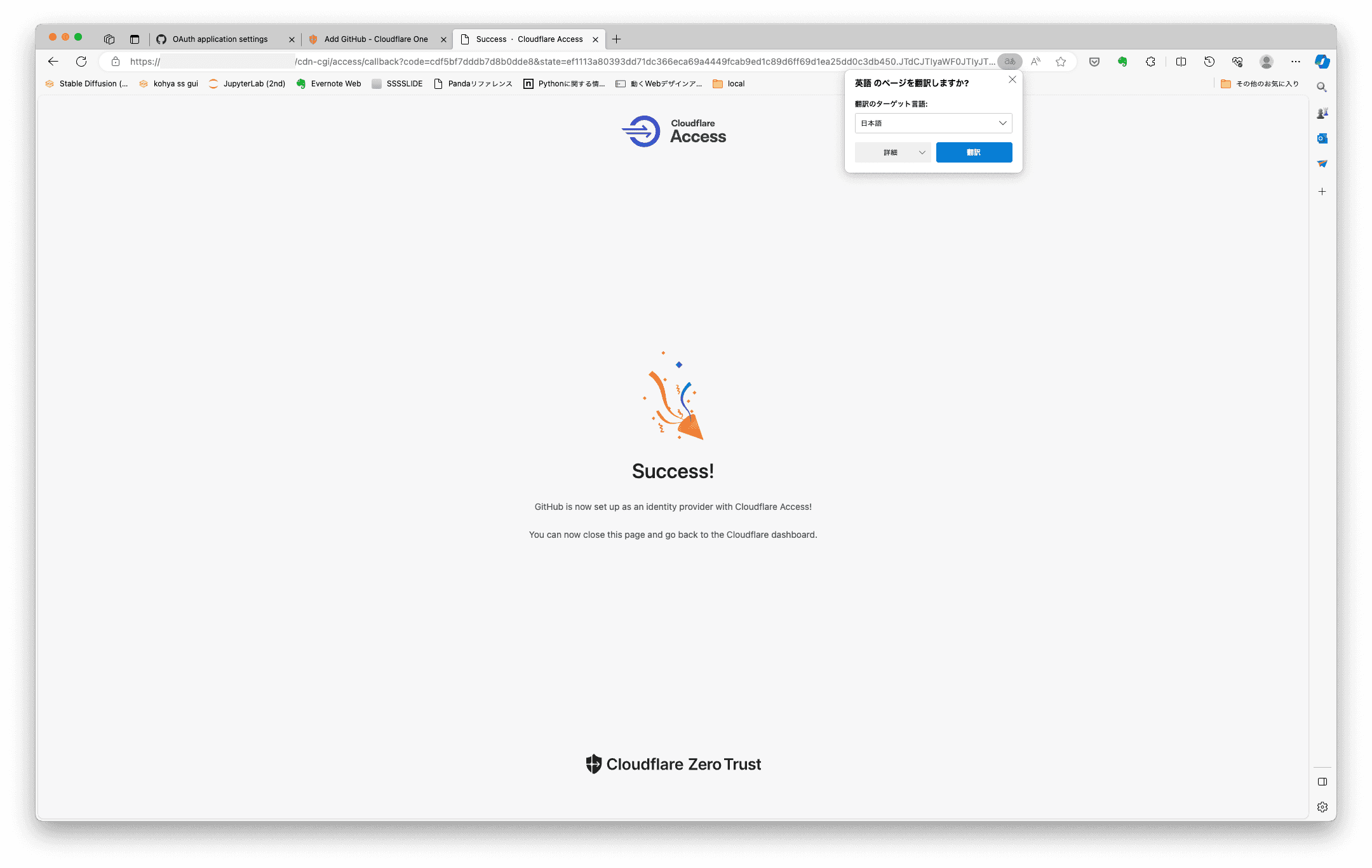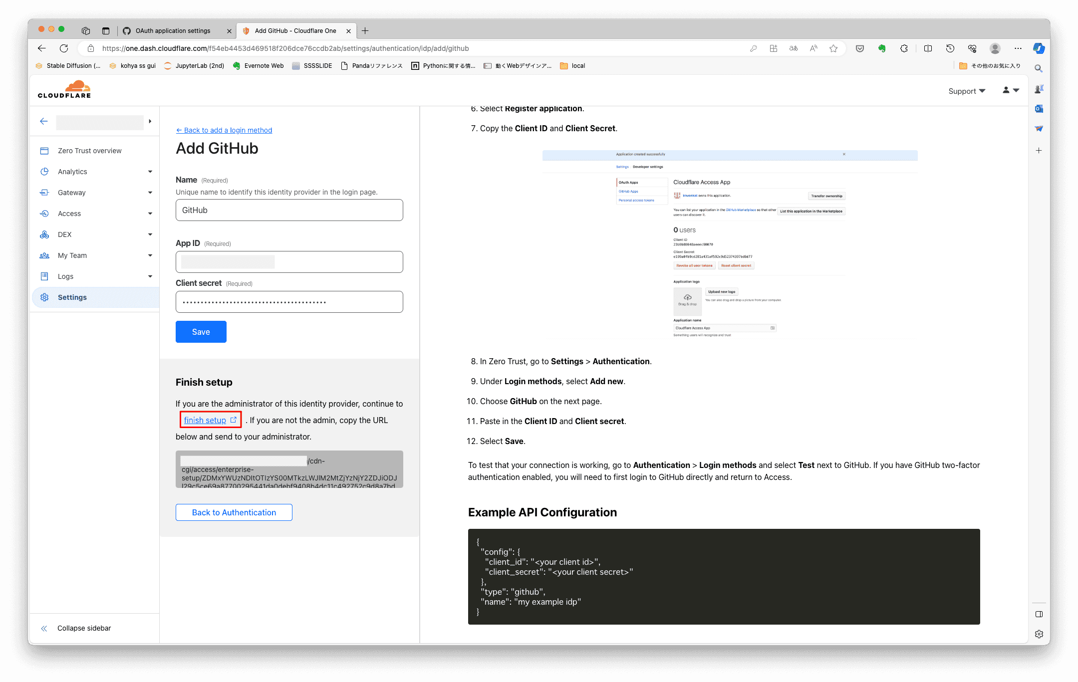 再びCloudflareの画面に戻ります。GitHub側で表示されたApp IDと作成したclient secretを入力しsaveするとFinish setupが表示されます。リンククリックすると、認証のテスト画面に移動します。