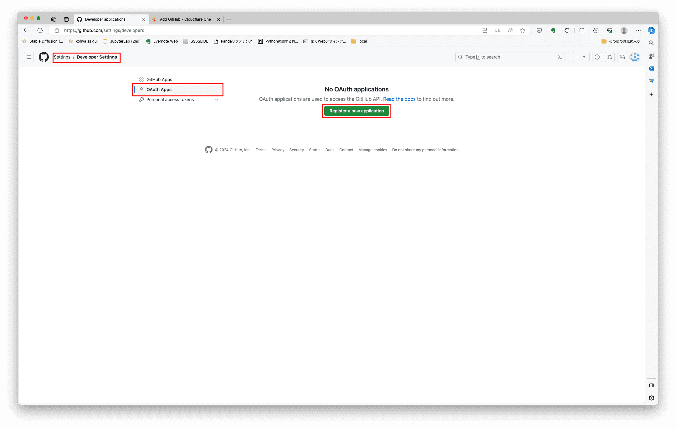 ここでGitHubの設定ページに移ります。GitHubのSetings / Developer SettingsからOAuth Appsページに移動し、Registar a new applicationをクリックします。