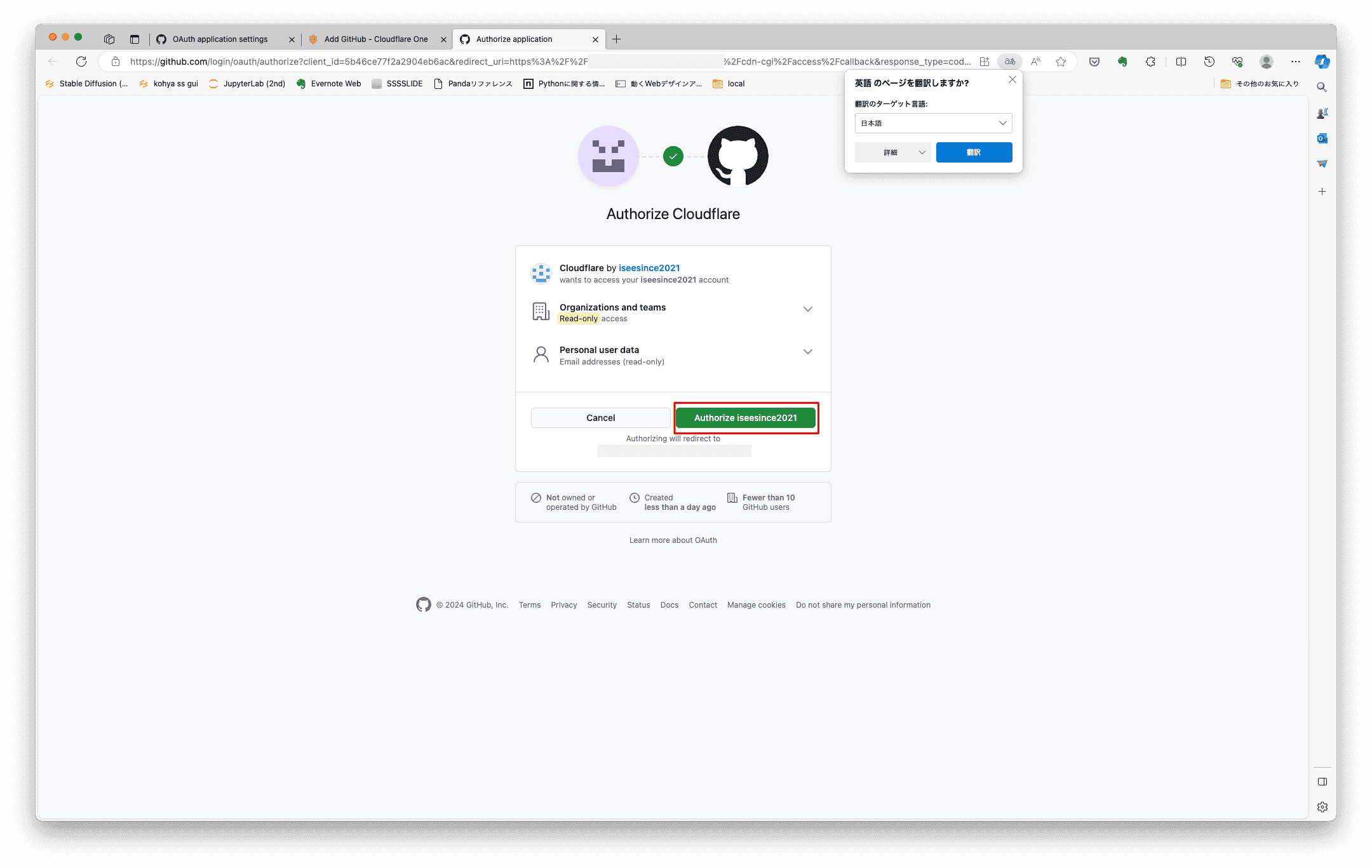 移ったGitHubの画面でAuthorize ユーザー名をクリックすると、認証のテストが行われ、OAuth認証が有効になります。