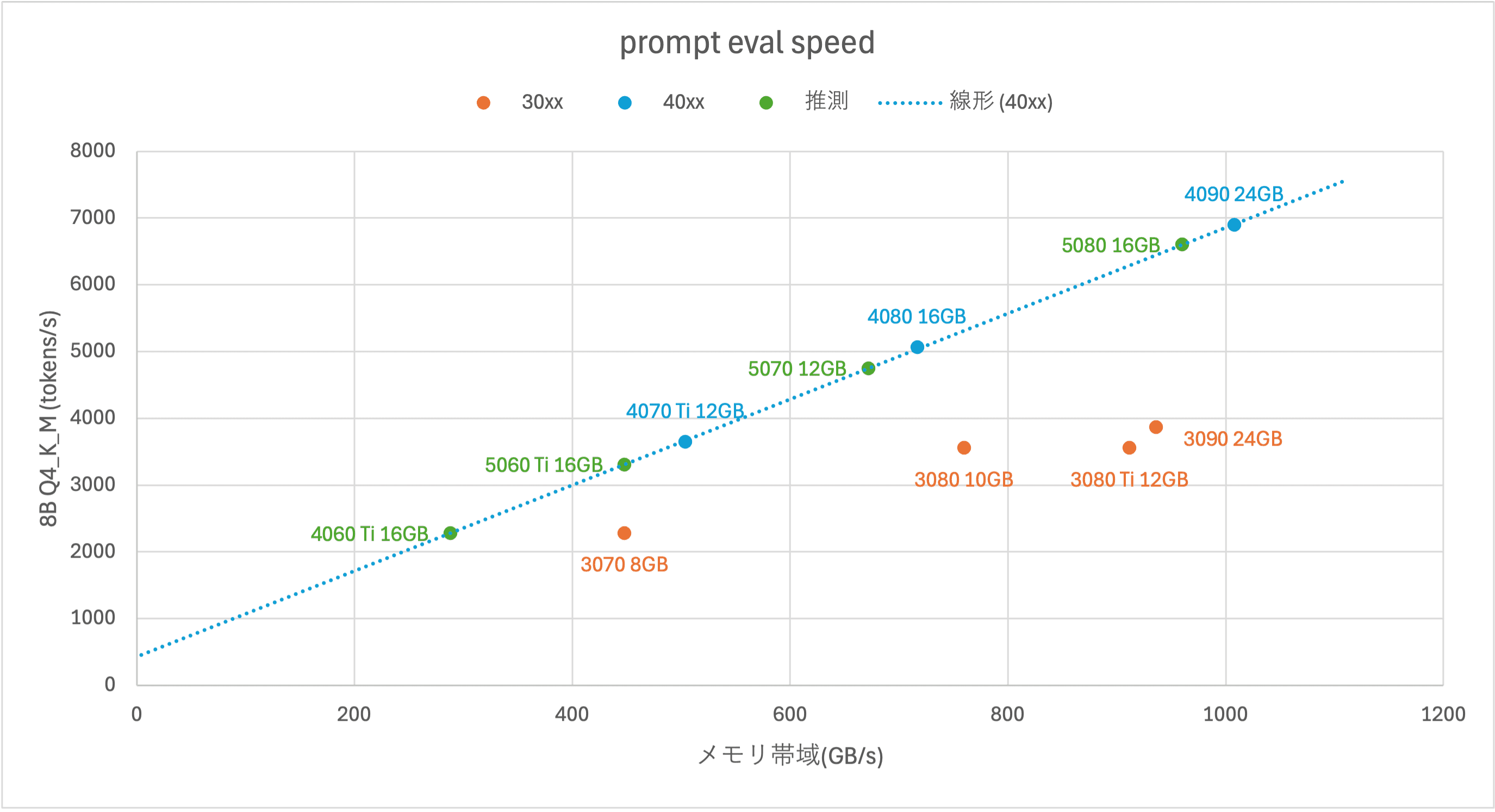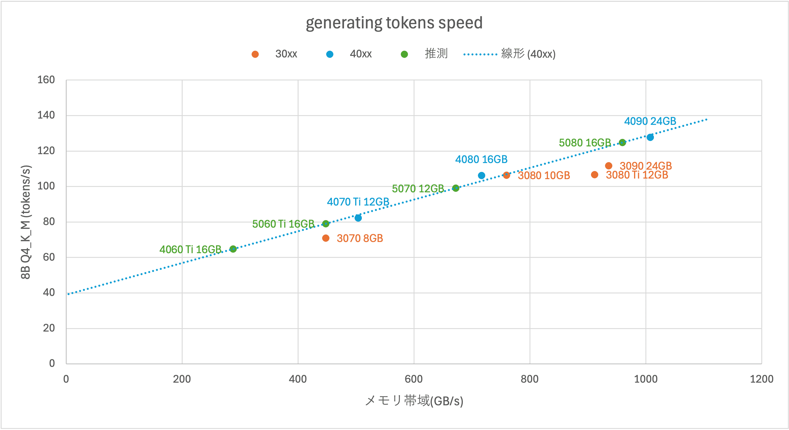 オレンジ色と水色のデータから、同じシリーズのGPUであれば、LLMの動作速度はメモリ帯域と相関関係があることがわかります。なので、メモリ帯域がわかればどれくらいの速度でLLMが動くか推測ができます。
